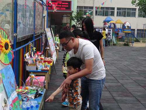 展览期间,幼儿园内热闹非凡,孩子们一个个欢呼雀跃地拉着爸爸妈妈的手,纷纷去找自己的作品。老师、家长和孩子们指着、看着,说着、笑着,感叹着、惊喜着、幸福着、甜蜜着,他们完全沉浸在这片欢乐的海洋中。