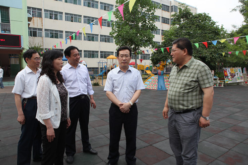 5月27日上午,学校党委书记徐剑波在副校长吴衍涛,后勤处长申曰江等同志的陪同下,到幼儿园问候和祝福老师和小朋友们,提前祝小朋友“六一”国际儿童节快乐。