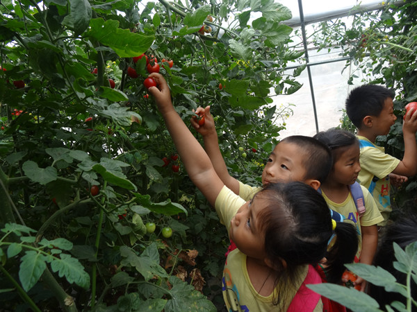 孩子们的喜悦和兴奋之情,在到达农场的瞬间被点燃。整齐排列的塑料大棚,种植了番茄、黄瓜、豆角、甜瓜等各种果蔬。在工作人员的讲解下,孩子们了解了大棚种植植物的基本常识,观察认识了各种蔬菜的花、茎、叶,知道了果实成熟过程中的变化,并且进行了有趣的采摘活动。孩子们在劳动过程中感受到了收获的喜悦,知道青菜是从地里采摘后,运输到超市和菜市场,经过加工才变成可口的菜肴。教师也抓住教育契机,积极教育孩子们养成爱惜粮食,不挑食的好习惯。