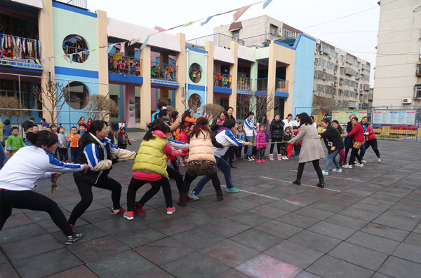 三月八日下午三点钟,幼儿园组织全体教职工和幼儿在操场上举行了一场活泼生动的拔河比赛,一起庆祝 “三八”妇女节。比赛分大、中、小三个级部进行,幼儿园小朋友是整场比赛中热情的拉拉队员,他们不断为老师们呐喊助威,老师们奋力拼搏的精神也感染着现场的每个幼儿,气氛非常热烈。经过激烈的角逐,小班级部最终拿到比赛冠军。
