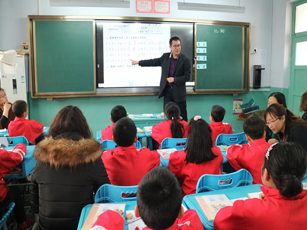 首先,由迎胜小学教师安新颖为四年级二班上了一节《因数和倍数》数学课,安新颖通过启发学生画图列式理解概念,一边讲解一边板书,当这堂课接近尾声时,黑板上呈现出一副完整的思维导图,孩子们看着思维导图,轻松地把整堂课的概念清晰的印在脑海里。接下来,泰安第一实验学校教师李国强在五年级一班讲授《比例的意义》。李国强用诙谐的语言,轻松的师生互动,在短短几分钟内就引导孩子提出整堂课需要解决的问题,并引导孩子自主学习。通过变革学习方式,他采用“提出问题——自主解决问题——顺势而导,释疑答难——练习拓展,讲练结合”的方法,让学生轻松愉快地掌握了所学的知识。最后还让学生们互评,让孩子们在评价中学会了赏识别人,深深触动了孩子的心灵。