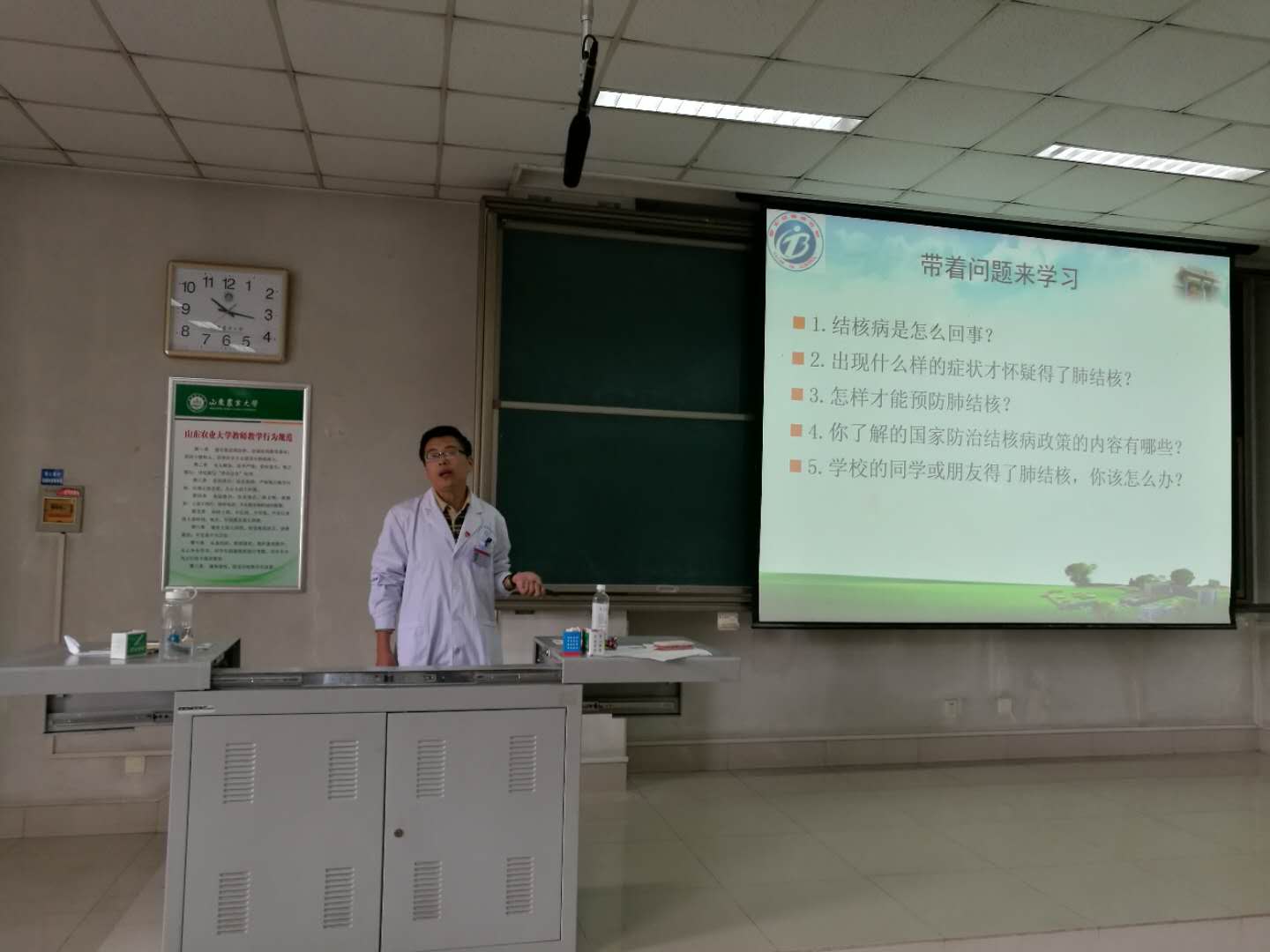 在泰安市结核病防治中心的指导、安排下,由在结核工作一线的孟凡亮医生主讲。孟医生从当前结核病疫情、什么是结核病、传播途径、结核病症状及治疗等方面系统阐述了结核病防治知识,同时向同学们发出做宣传结核病防治知识志愿者的倡议。通过授课,使同学们对结核病防治知识有了进一步了解。会后校医院工作人员给参加讲座的学生免费进行了X光检查。根据泰安市结核病防治中心安排,拟定于10月23日给入学体检时结核抗体检测阳性的新生注射微卡疫苗提高免疫力,对肺结核进行预防性干预。