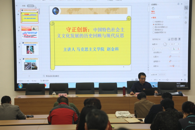 赵金科作了题为《守正创新:中国特色社会主义文化发展的历史回顾与现代反思》的宣讲报告,他从古代中国文化、近代中国文化、新民主主义革命文化、文革期间和改革开放初期的文化、社会主义先进文化以及中国特色社会主义文化建构的科学方法论等六个方面回顾、反思和总结了中国近现代文化发展的经验与教训,对广大党员从文化发展的角度学习党的历史,学习文化强国建设,增强和坚定文化自信具有很强的理论指导作用。