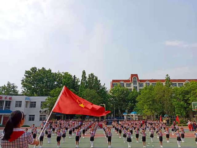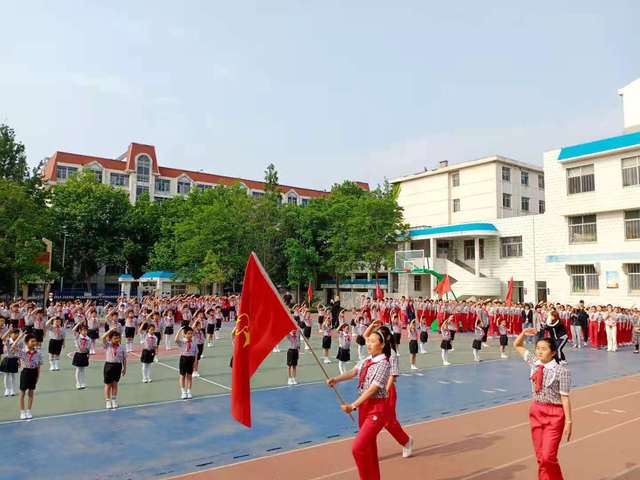 伴随着熟悉而有力的出旗曲,少先队旗手们迈着整齐的步伐,精神抖擞地进行着庄严的出旗仪式,星星火炬队旗和红领巾随风飘扬,少先队入队仪式由此拉开帷幕。随着雄壮高昂的旋律响起,同学们高唱队歌,嘹亮的歌声表达了同学们对少先队的热爱。在全校老师和老队员的见证下,由优秀的少先队员代表为78名新队员佩戴上了革命烈士用鲜血染成的红领巾,并授予新中队中队旗。新队员跟随大队长在队旗下郑重宣誓,将用自己满腔的热情为中国少年先锋队添一份力量。