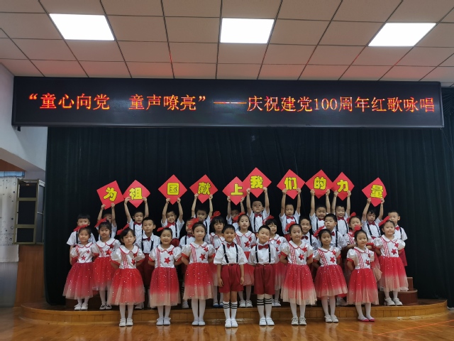 首先,小班级部的孩子们挥动着鲜艳的五角星,用稚嫩的歌声表达了对党和祖国热爱。随后,中班合唱团逐一登场,先后歌唱了《歌唱祖国》《童心向党》《名字叫中国》《红红的太阳》等脍炙人口的爱国歌曲。接下来,大班的孩子们穿着整齐的服装,用整齐划一的动作、热情饱满的歌声展现了新时代儿童昂扬的精神风貌。最后,教师们还现场演唱了《把一切献给党》,抒发了对党的热爱之情!