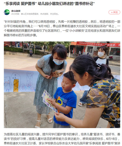 6月16日,我校幼儿园大一班教师、幼儿及部分家长走进农大社区开展“乐享阅读爱护图书”宣讲活动。