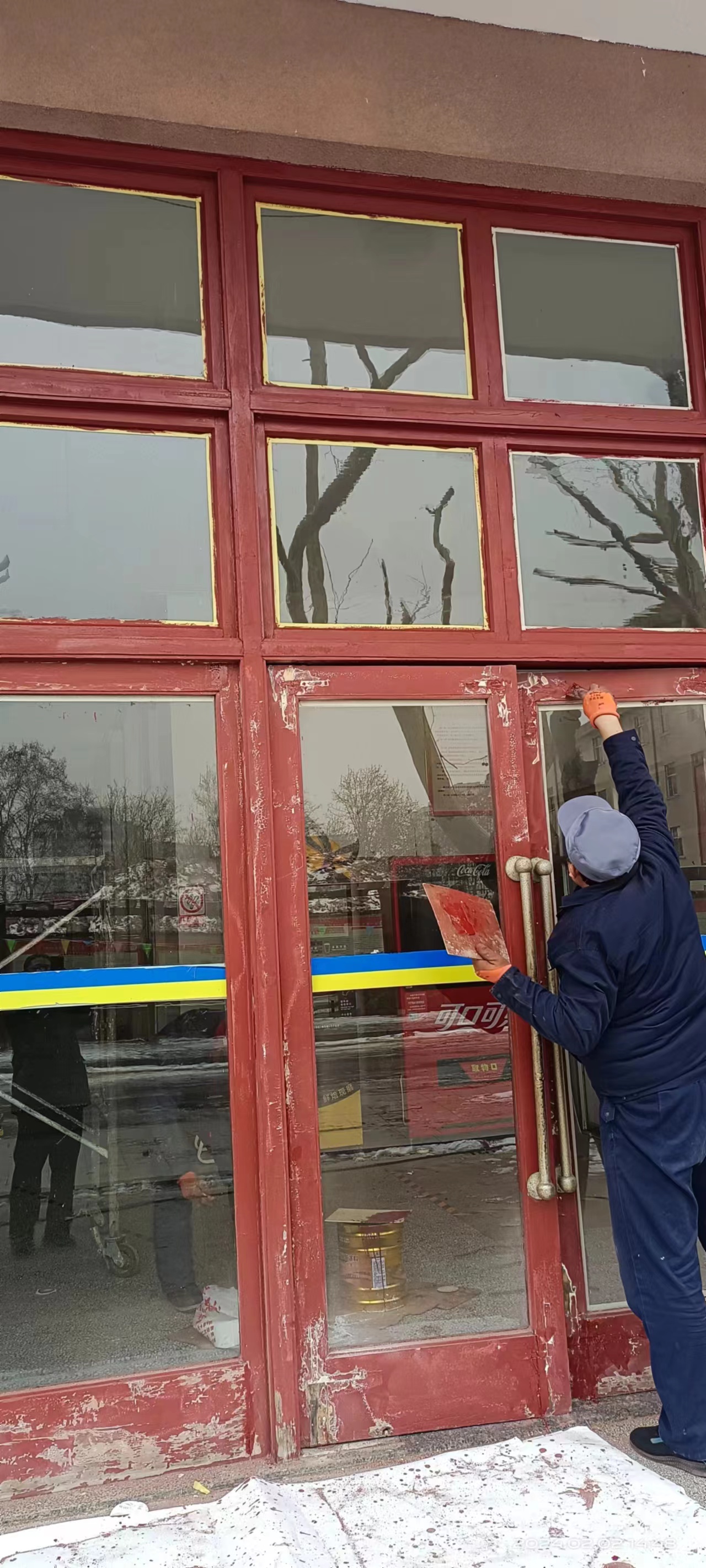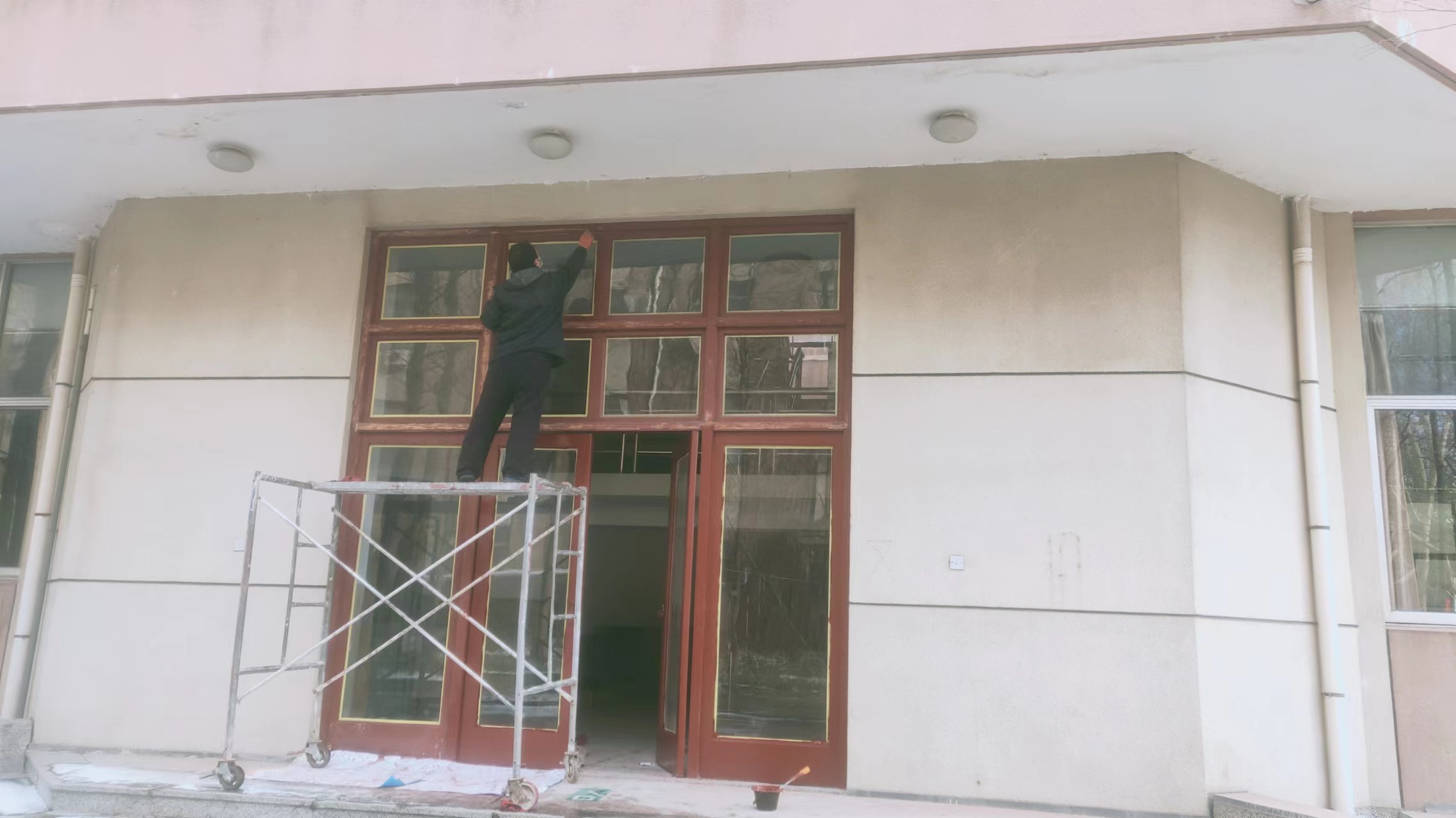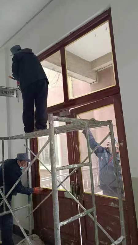 铝合金班组制定科学的实施方案,克服低温和雨雪困难,认真清理木门表面,砂纸打磨后刮腻子找平,仔细调色刷漆,保持原有风格,顺利完成岱宗校区5N、5S教学楼木门粉刷工作,使教学楼门厅焕然一新,为学生创造良好的学习环境。