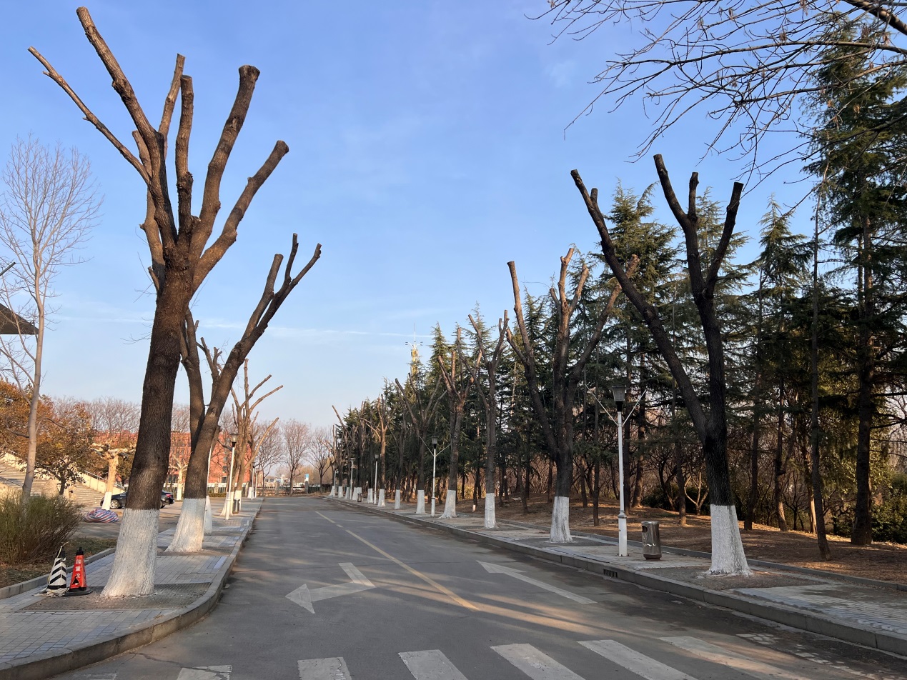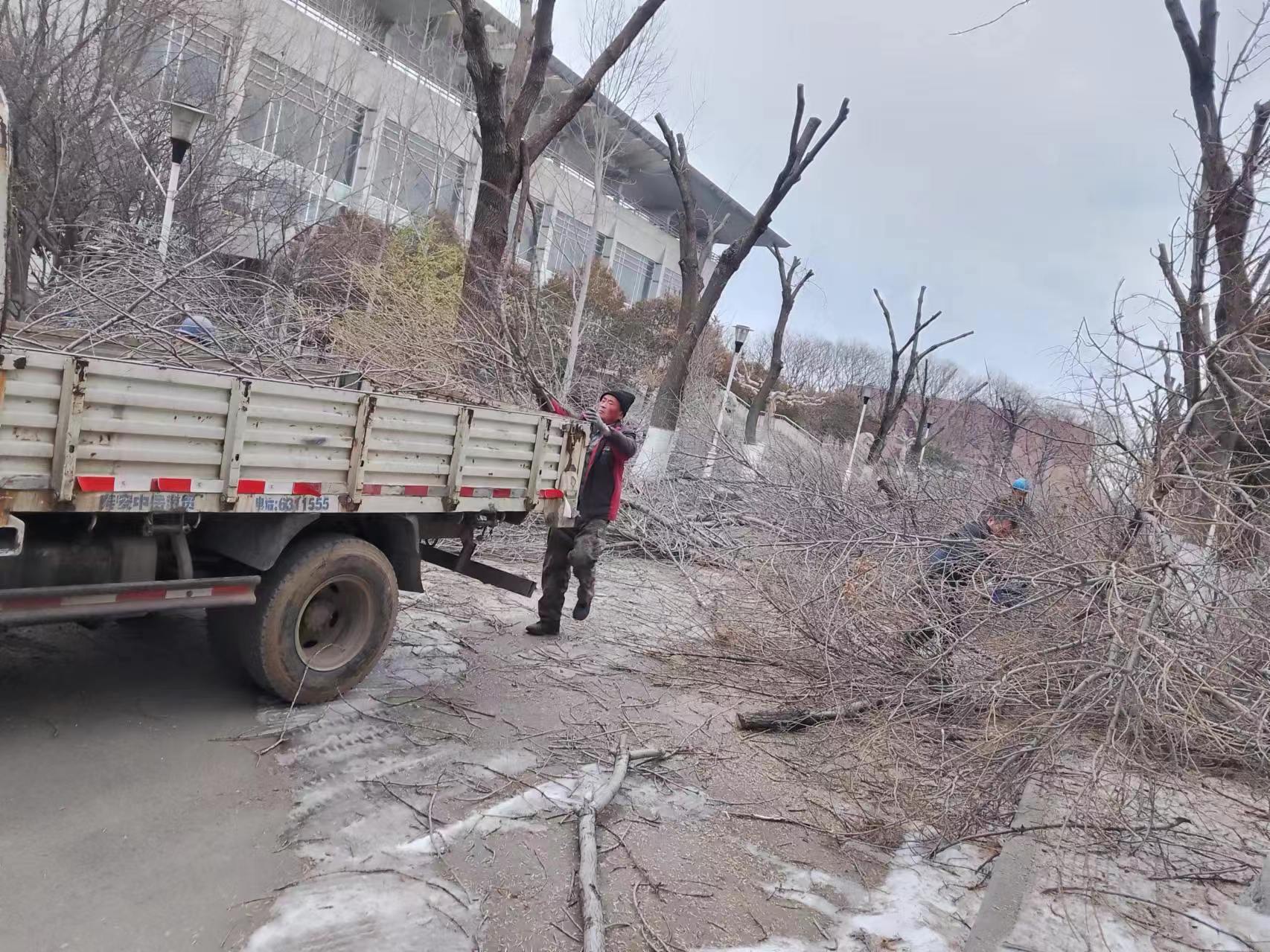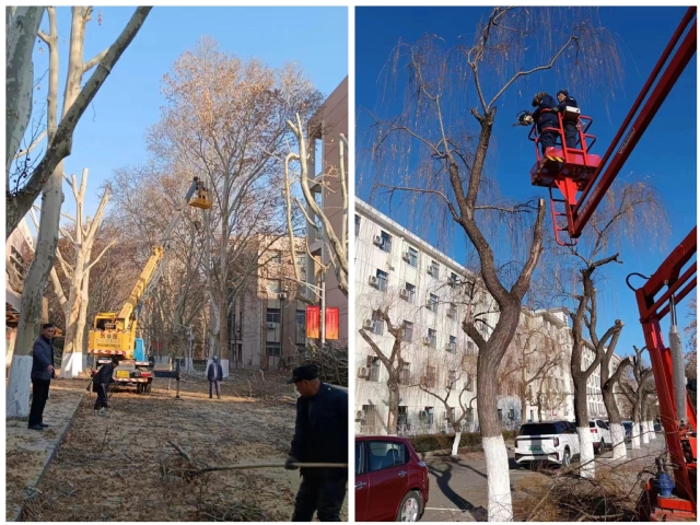 为进一步美化校园环境、消除安全隐患,后勤管理处物业管理中心利用寒假期间,对校园内的高大树木进行了修剪和养护工作。